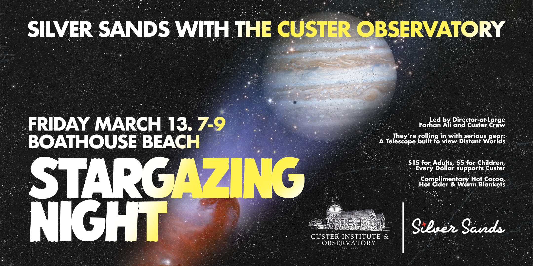 $10 General Admission, Custer Observatory Members FREE. Due to limited space, registration is strongly encouraged. All event updates including weather cancellations will be sent to the email address used at ticket checkout. Please check your email and/or Custer Observatory's website the morning of the event in case a cancellation is announced.